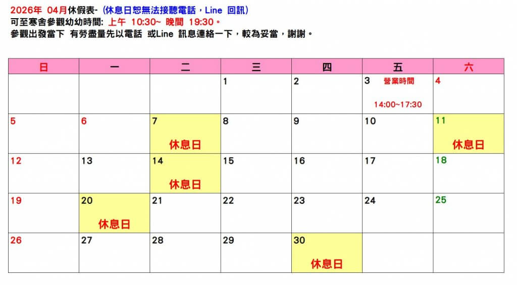 【2026/04休假表】 (點選一下月曆,可以放大看唷)